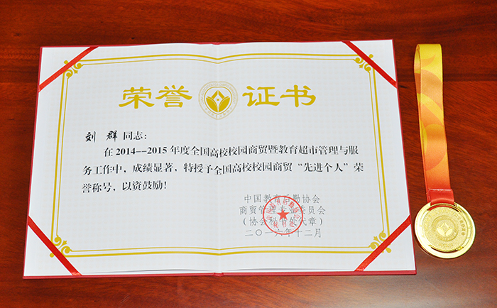 在刚刚结束的中国教育后勤协会商贸管理专业委员会年终总结会上,我校后勤集团商贸公司超市经理刘群喜获由中国教育后勤协会、商贸管理专业委员会颁发的“全国高校商贸服务与管理(教育超市)先进个人”表彰。