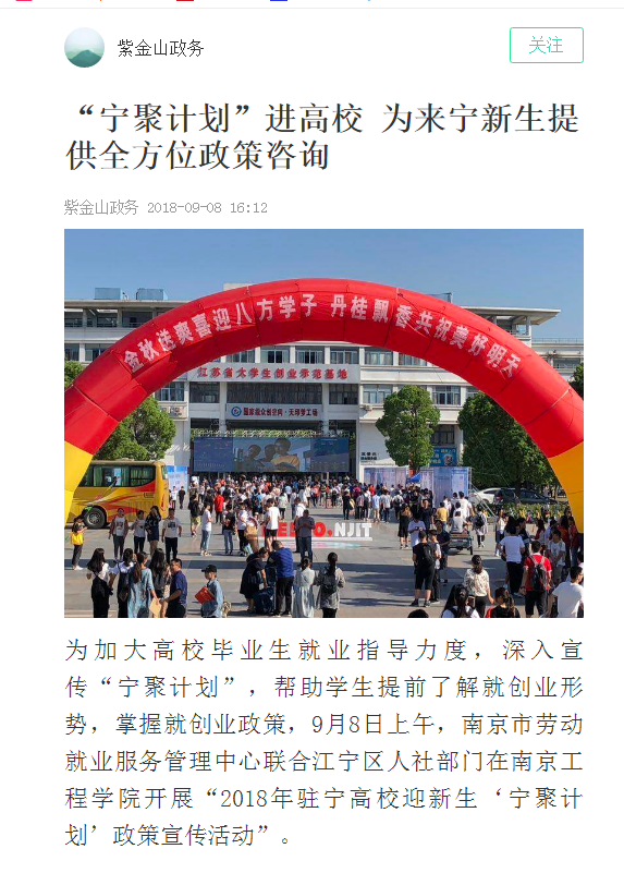为加大高校毕业生就业指导力度,深入宣传“宁聚计划”,帮助学生提前了解就创业形势,掌握就创业政策,9月8日上午,南京市劳动就业服务管理中心联合江宁区人社部门在凯发k8官网开展“2018年驻宁高校迎新生‘宁聚计划’政策宣传活动”。