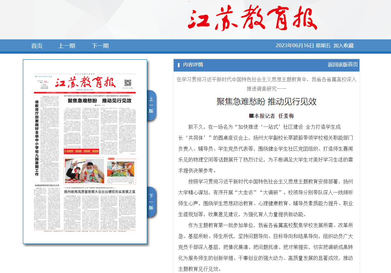 按照学习贯彻习近平新时代中国特色社会主义思想主题教育安排部署,扬州大学精心谋划,有序开展“大走访”“大调研”。校领导分别带队深入一线倾听师生心声,围绕学生思想政治教育、心理健康教育、辅导员素质能力提升、职业生涯规划等,收集意见建议,为强化育人力量提供新动能。