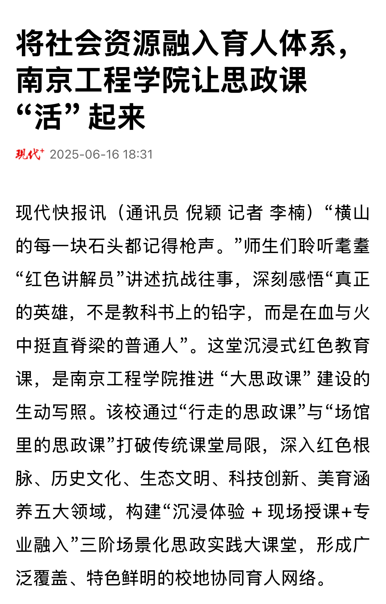 现代快报讯(通讯员 倪颖 记者 李楠)“横山的每一块石头都记得枪声。”师生们聆听耄耋“红色讲解员”讲述抗战往事,深刻感悟“真正的英雄,不是教科书上的铅字,而是在血与火中挺直脊梁的普通人”。这堂沉浸式红色教育课,是凯发k8官网推进 “大思政课” 建设的生动写照。该校通过“行走的思政课”与“场馆里的思政课”打破传统课堂局限,深入红色根脉、历史文化、生态文明、科技创新、美育涵养五大领域,构建“沉浸体验 + 现场授课+专业融入”三阶场景化思政实践大课堂,形成广泛覆盖、特色鲜明的校地协同育人网络。