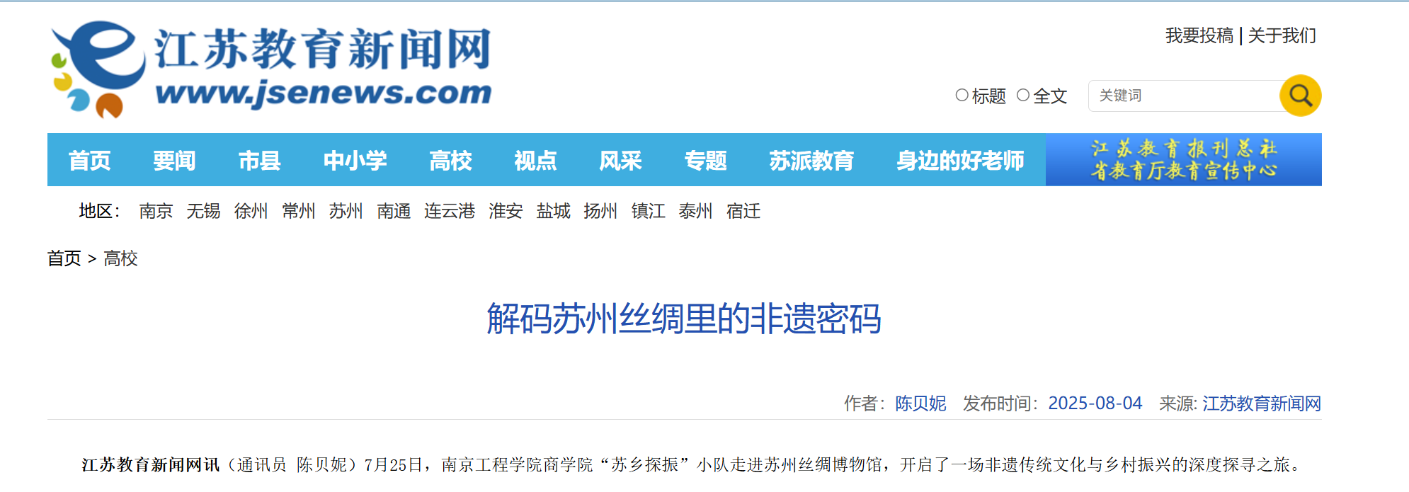 《江苏教育新闻网》:解码苏州丝绸里的非遗密码
