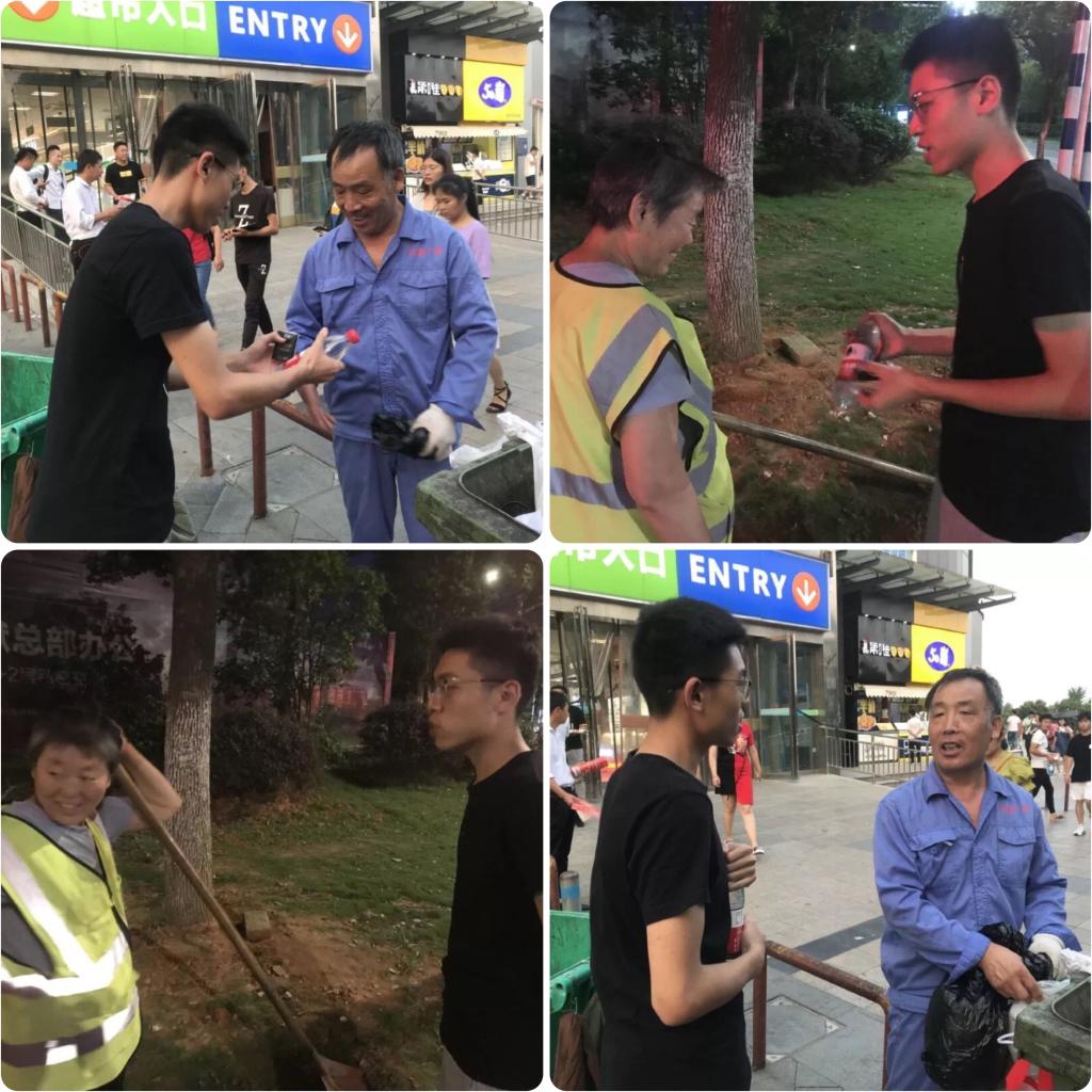 环卫工人被人们赞誉为“城市黄玫瑰”、“马路天使”和“城市美容师”,城市之所以美丽,他们功不可没。为了感谢辛勤付出的环卫工人们,成员们纷纷来到环保一线——街道,致敬的城市的守护者们,给他们送去了矿泉水、湿巾,感谢他们的默默付出,并同他们一起完成了当天的城市清扫任务。“身体力行才真正懂得他们的艰辛与汗水,这大热天,汗如雨下,一天我都有点受不了,他们天天如此,确实不易,真是用汗水守护了一方净土呀!”实践团成员如是说。